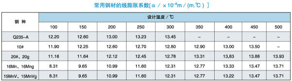 α—管材的線膨脹系數(shù);L—直管段長度;t1—管道安裝設(shè)計溫度;t2—管道內(nèi)介質(zhì)溫度;常用鋼材線膨脹系數(shù)如下圖(2):