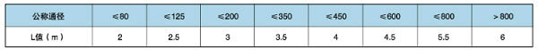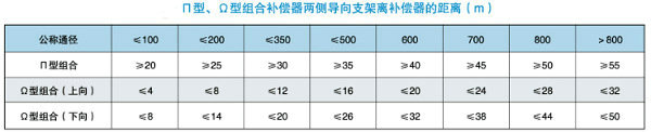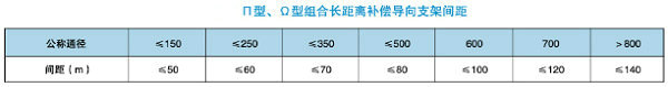 因旋轉(zhuǎn)補償器的補償量特別大,所以固定支架間距也隨之增大,其間距一般由設(shè)計管段的補償量大小決定,為避免長距離管道撓曲失穩(wěn),需在一定距離內(nèi)安裝導(dǎo)向支架,同時為減小管段運行的摩擦阻力,在導(dǎo)向支架上應(yīng)安放滾動支座,導(dǎo)向支架間距如下表:圖(8)